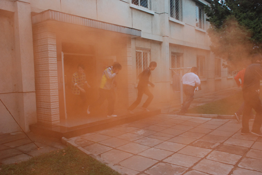 下午2:00时,在李警官的指导下,我们校区学管中心和保卫科组织师生进行了消防与防灾实战演练。在演练之前,我校保卫科田老师给学生讲解了干粉灭火器的操作使用、应急疏散演练的逃生方法以及应对突发事件的自救常识。而后,按照预定方案,假想设置突发情况,燃放烟幕弹,分别对2009级、2010级学生进行了安全实战演练,让学生掌握了宿舍防火、教室上课防震、校园恐怖袭击等各类突发事件的逃生方法与救援措施。本次教育与演练,再一次给广大师生敲响了安全的警钟,进一步提高了安全防范与自救能力,达到了预期的效果。